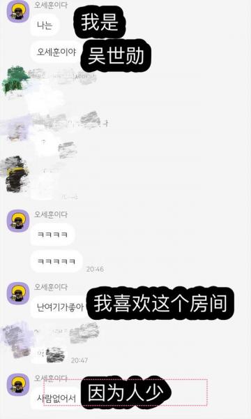 首先是世勋以“吴世勋伊哒(我是吴世勋)”的昵称空降Kakao Talk的明星孤独房(吴世勋孤独房4),然后发表了图上的留言。然后宝宝进了第四个房间,因为发的图跟之前在别的房间里发的差不多,大家弄混了。宝宝被当成骗子,被移出了群。